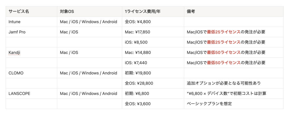 上記を踏まえて、実際にIntune、Jamf Pro、Kandji(Iru)、CLOMO、LANSCOPEの5サービスを比較した。