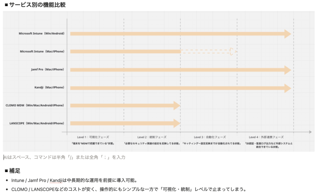 (個人的にIntune/Jamfに寄せたい気持ちがあったので恣意的に情報整理した感もあるが、)