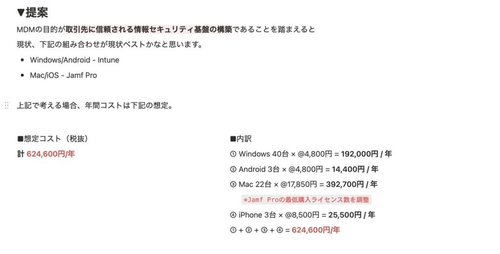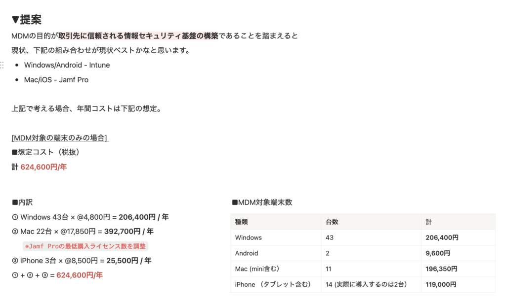 上記を踏まえ、最終的にはIntune、JamfProの2つを導入する形で提案し、無事導入が決まった。