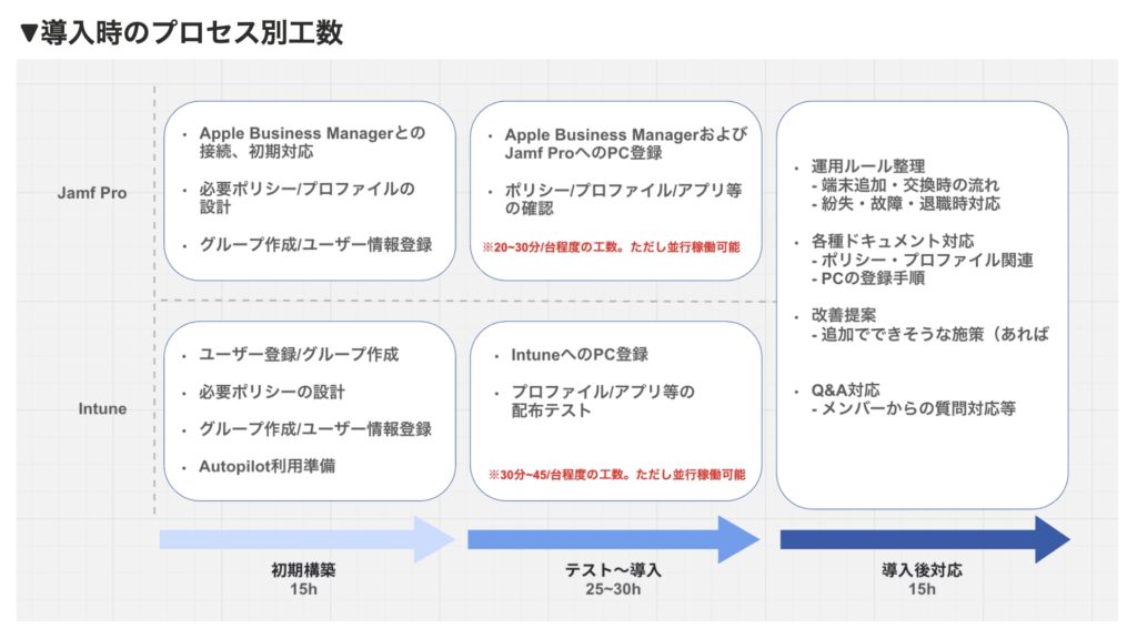 今回はJamf ProとIntuneの2サービスだったため、概ね↑のような工数イメージ&フェーズごとの作業イメージとなったが、ここは必要に応じてもう少し細分化したり、こちらで対応する作業を絞ることも可能だ。