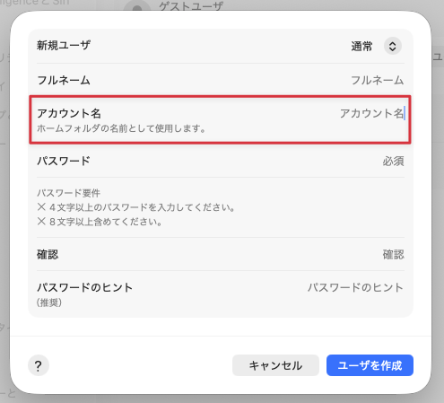 参考:Macでユーザアカウントのホームフォルダの名前を変更する – Apple サポート