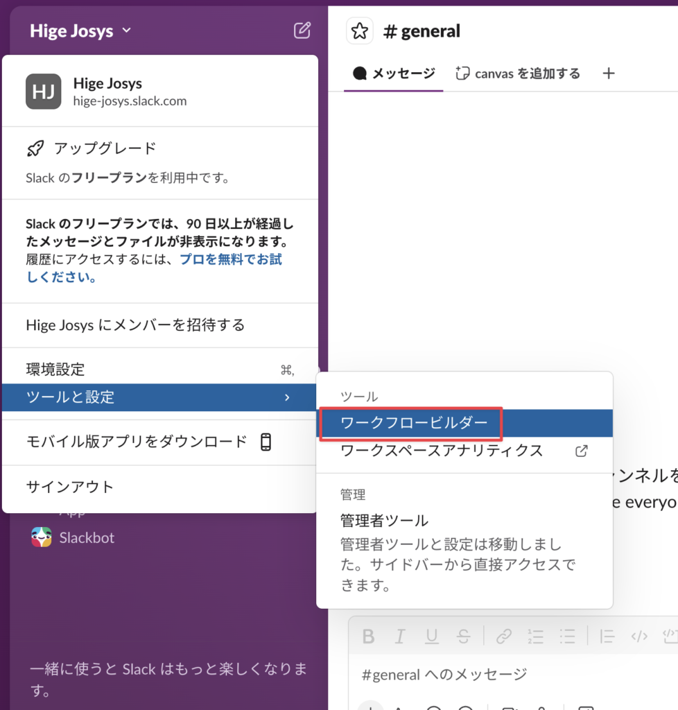 まずはSlackのメニューから「ツールと設定」>「ワークフロービルダー」を開く。