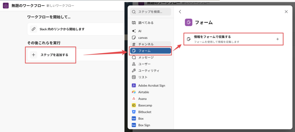 「ステップを追加する」>「フォーム」>「情報をフォームで収集する」を選択する。