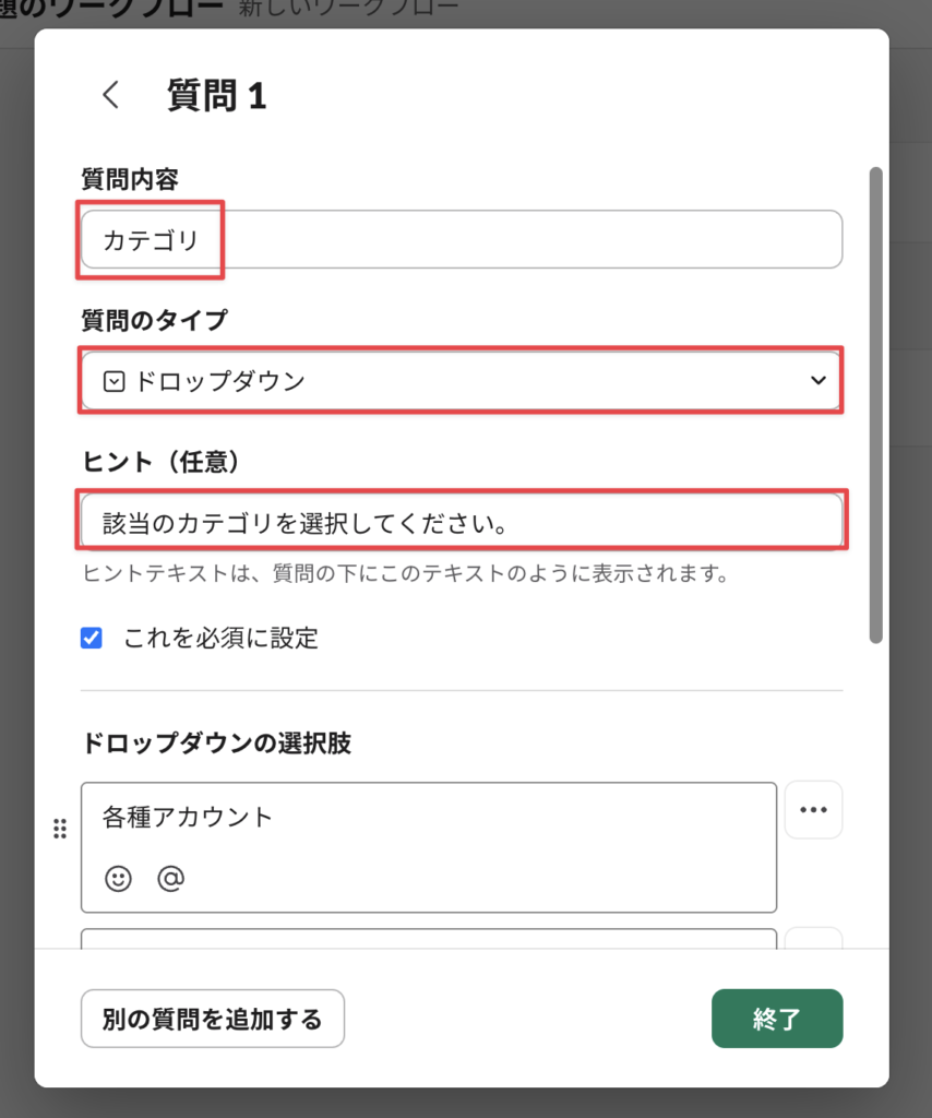 次に、ドロップダウン(カテゴリの選択肢)を作成して終了する。