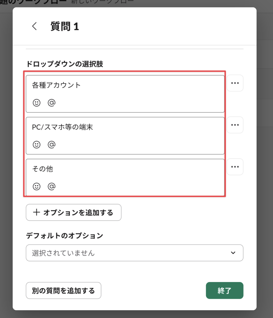 例として、まずヘルプデスク内容のカテゴリを聞く場合はこのようにする。