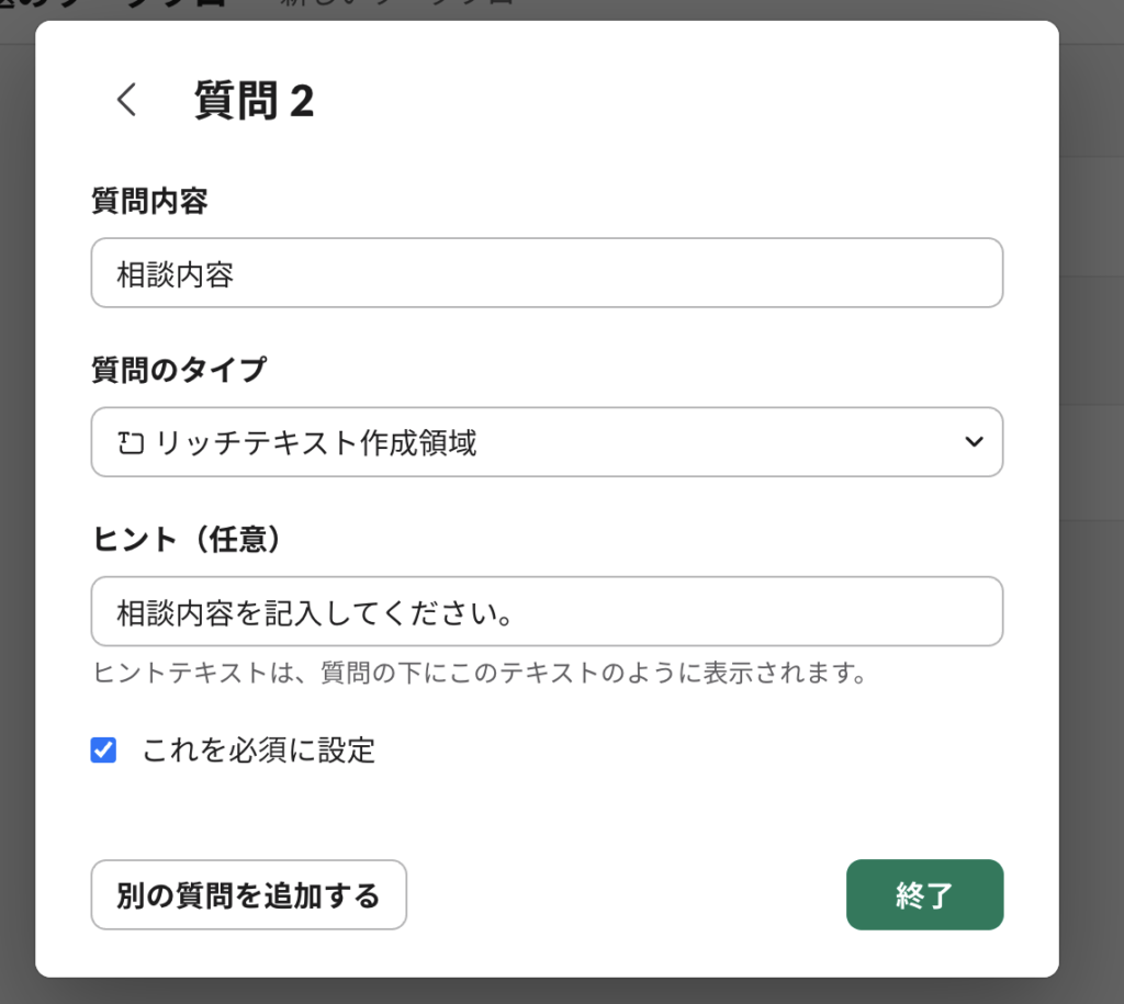 カテゴリの次は、「相談内容」の項目を作成する。