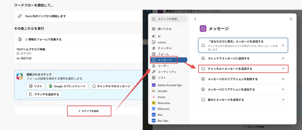 今回はワークフロー上の3ステップ目でチャンネルにメッセージを送信するので