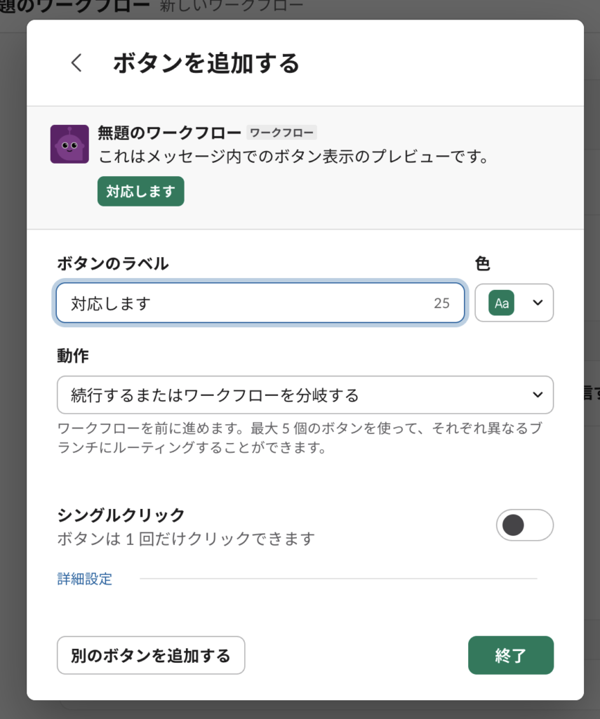 選択すると↓のような画面が出てくるので「ボタンのラベル」に”対応します”と入力して、完了する。