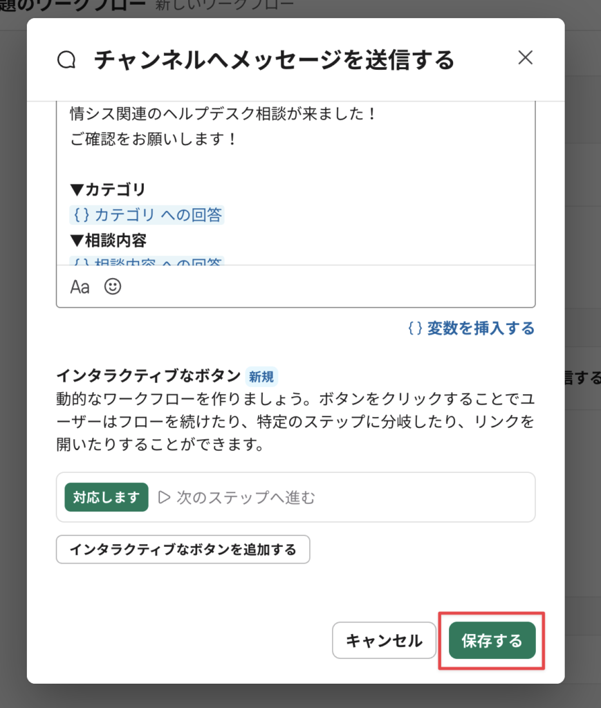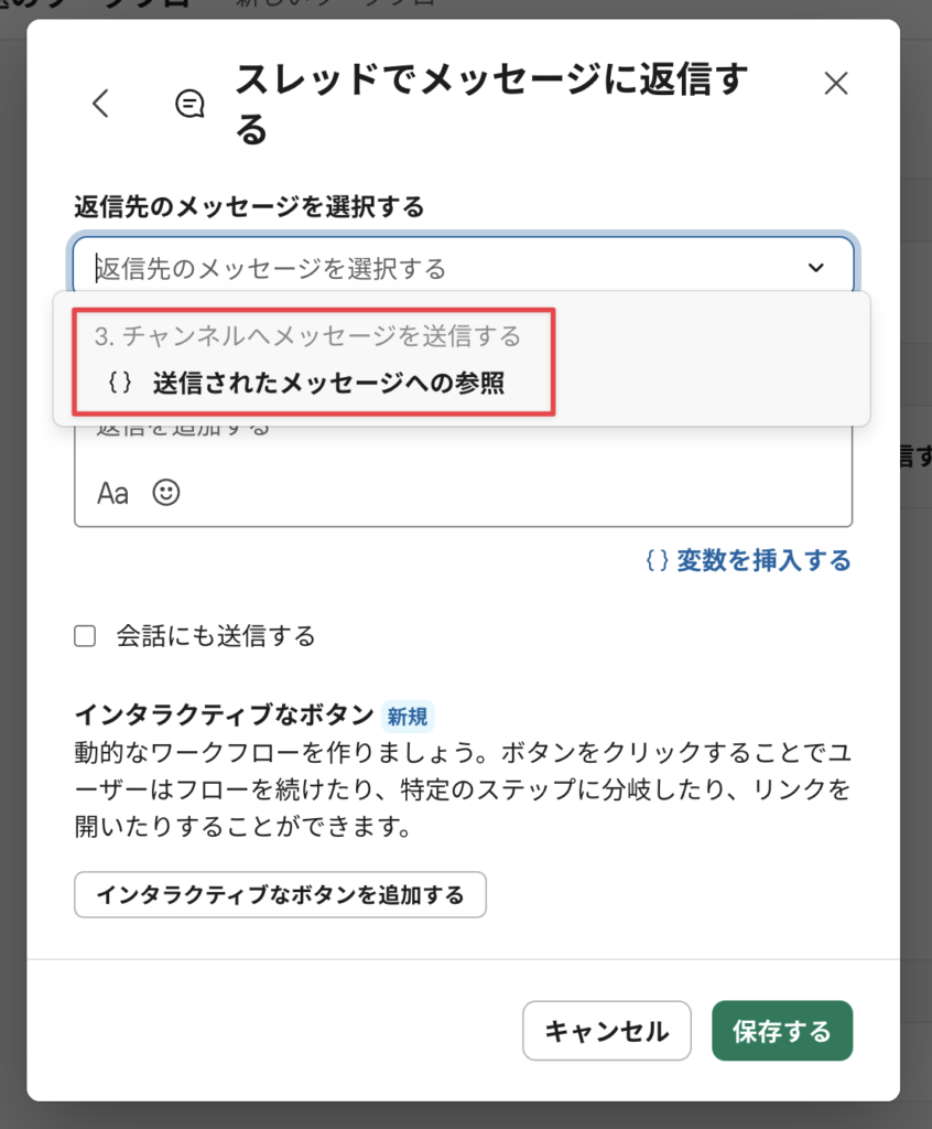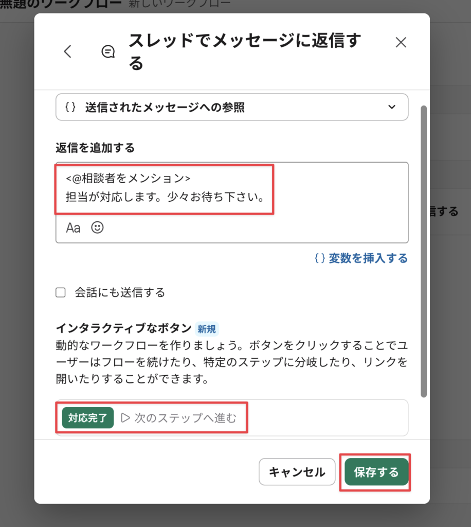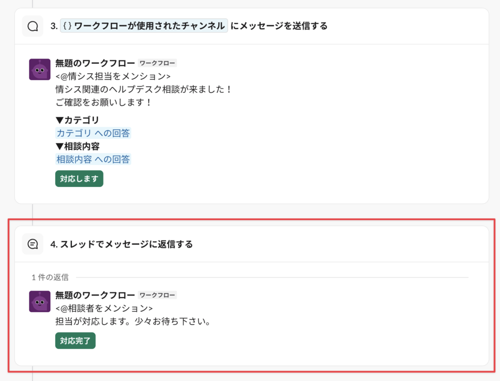 まず、↑直前に作った”チャンネルに投稿されるメッセージ”のスレッド内に「対応完了」ボタンを設置したいのでそのステップを作る。