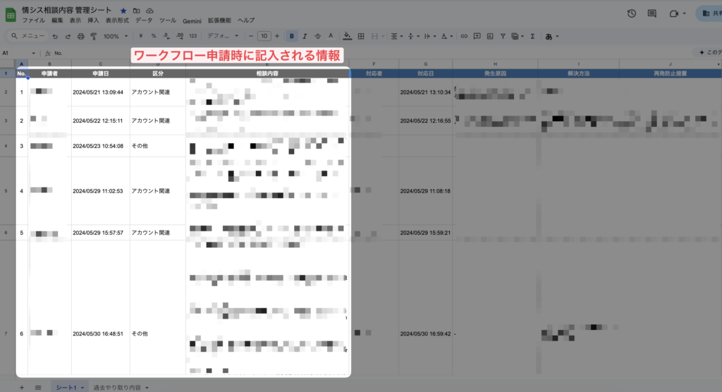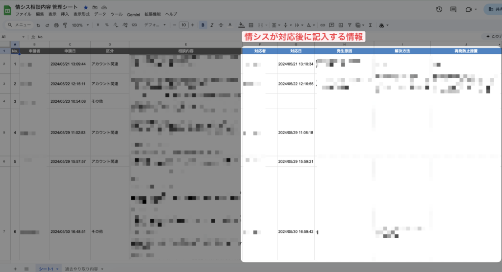 「相談→対応→解決までの情報をスプシ転記」を効率よく行うことができる。