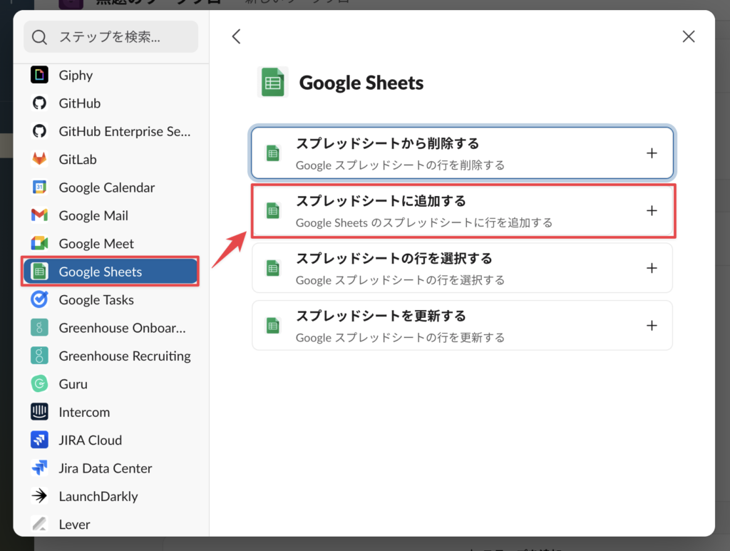 「Google Sheets」 >「スプレッドシートを更新する」を選択する。