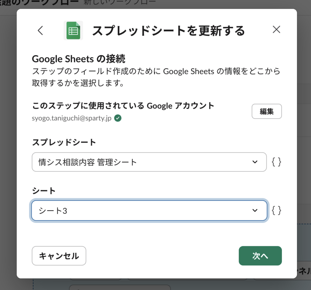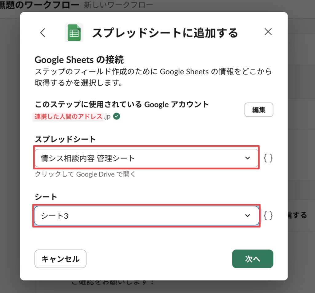 連携ができると転記先のスプレッドシートおよびシートを選択できるようになる。選択して次へ。