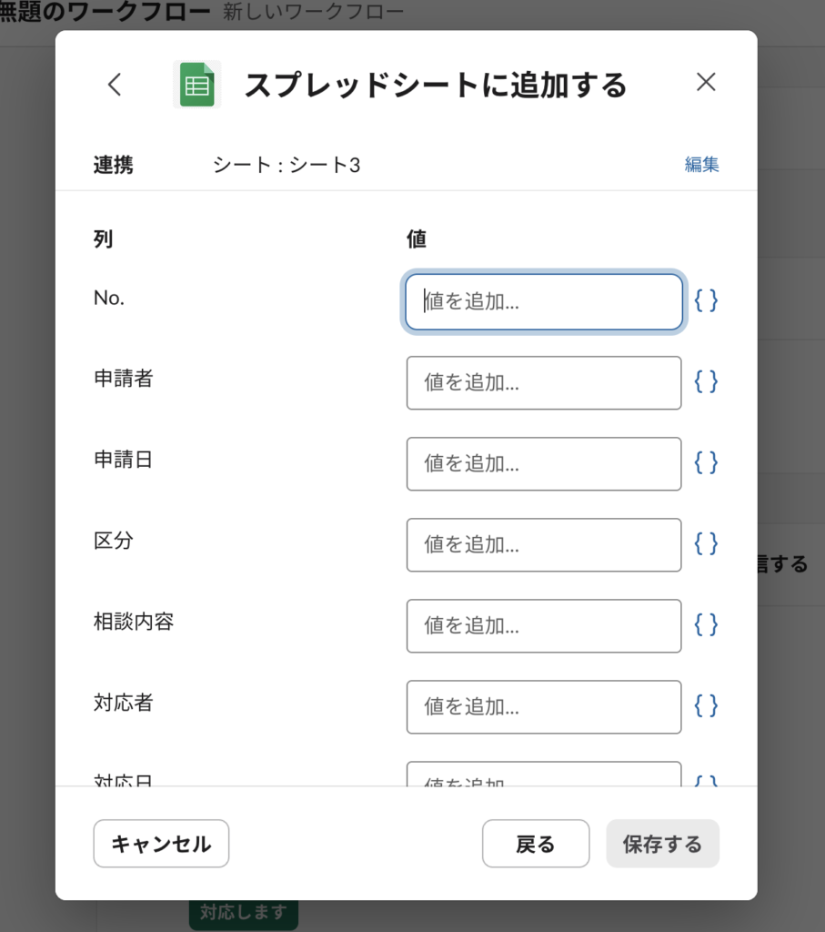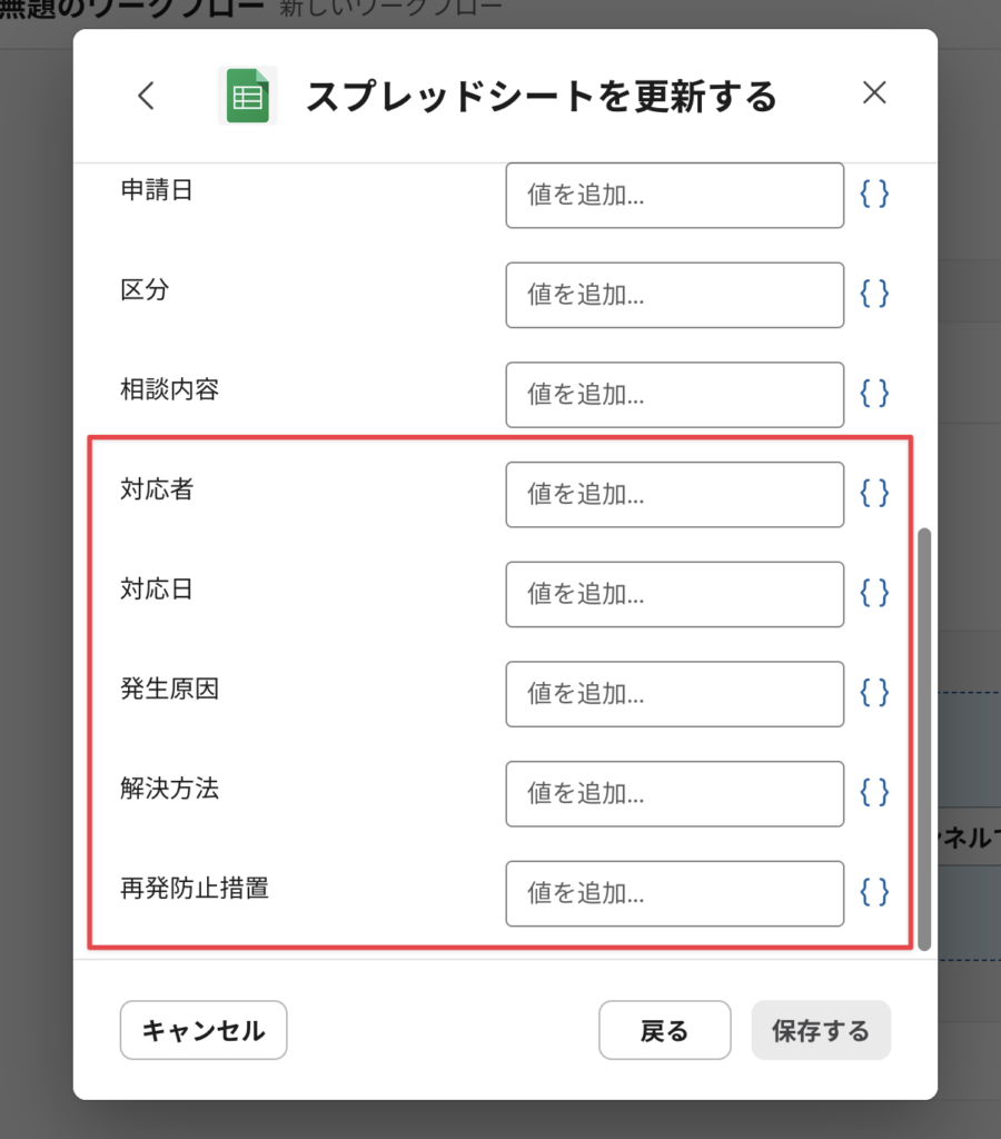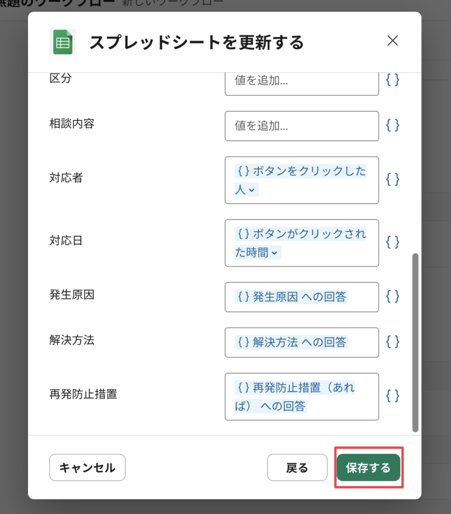 スプレッドシートを適切に更新するために、”更新する列”をワークフローに正しく選ばせる必要がある。