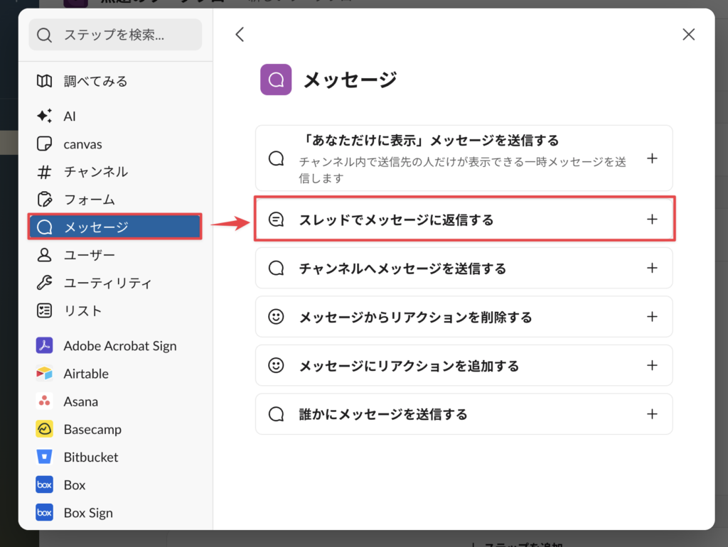 「+ステップを追加」>「メッセージ」>「スレッドでメッセージに送信する」を選択する。