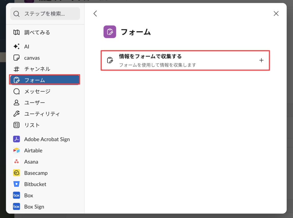 「+ステップを追加」>「フォーム」>「情報をフォームで収集する」を選択する。