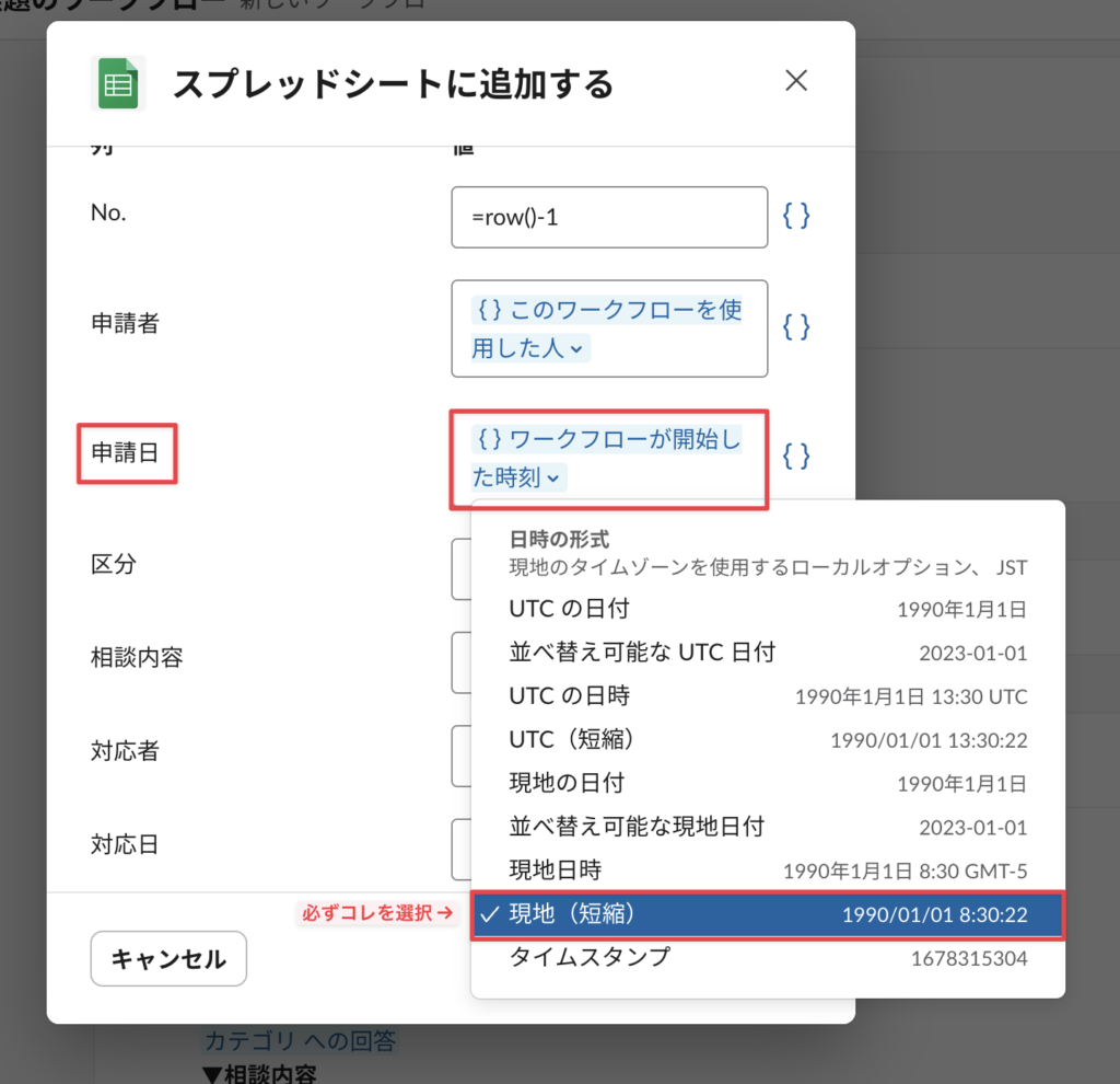 「申請日」は必ず「ワークフローが開始した時刻」で「現地(短縮)」を選択する。