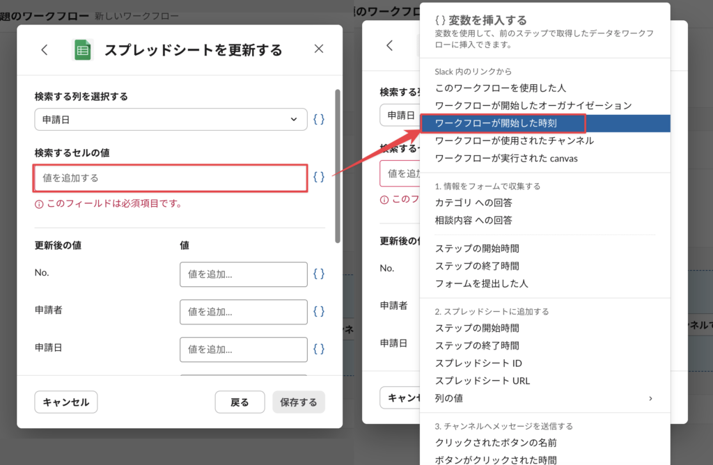 次に「検索するセルの値」だが、{ }から「ワークフローが開始した時刻」を選択する。