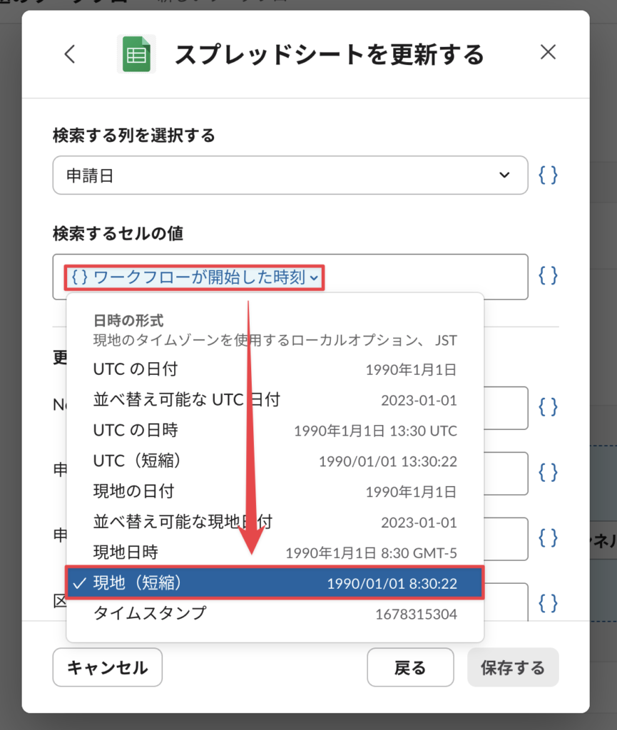 選択したら、「{ }ワークフローが開始した時刻」を選択して「現地(短縮)」を選択する。