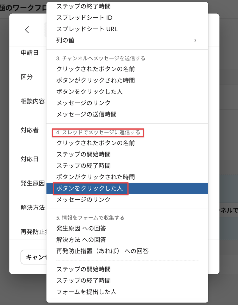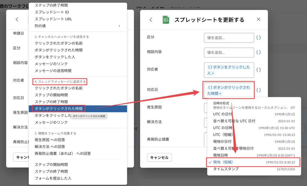 「対応日」は同じく「4.スレッドでメッセージに返信する」の「ボタンがクリックされた時間」を選択し、